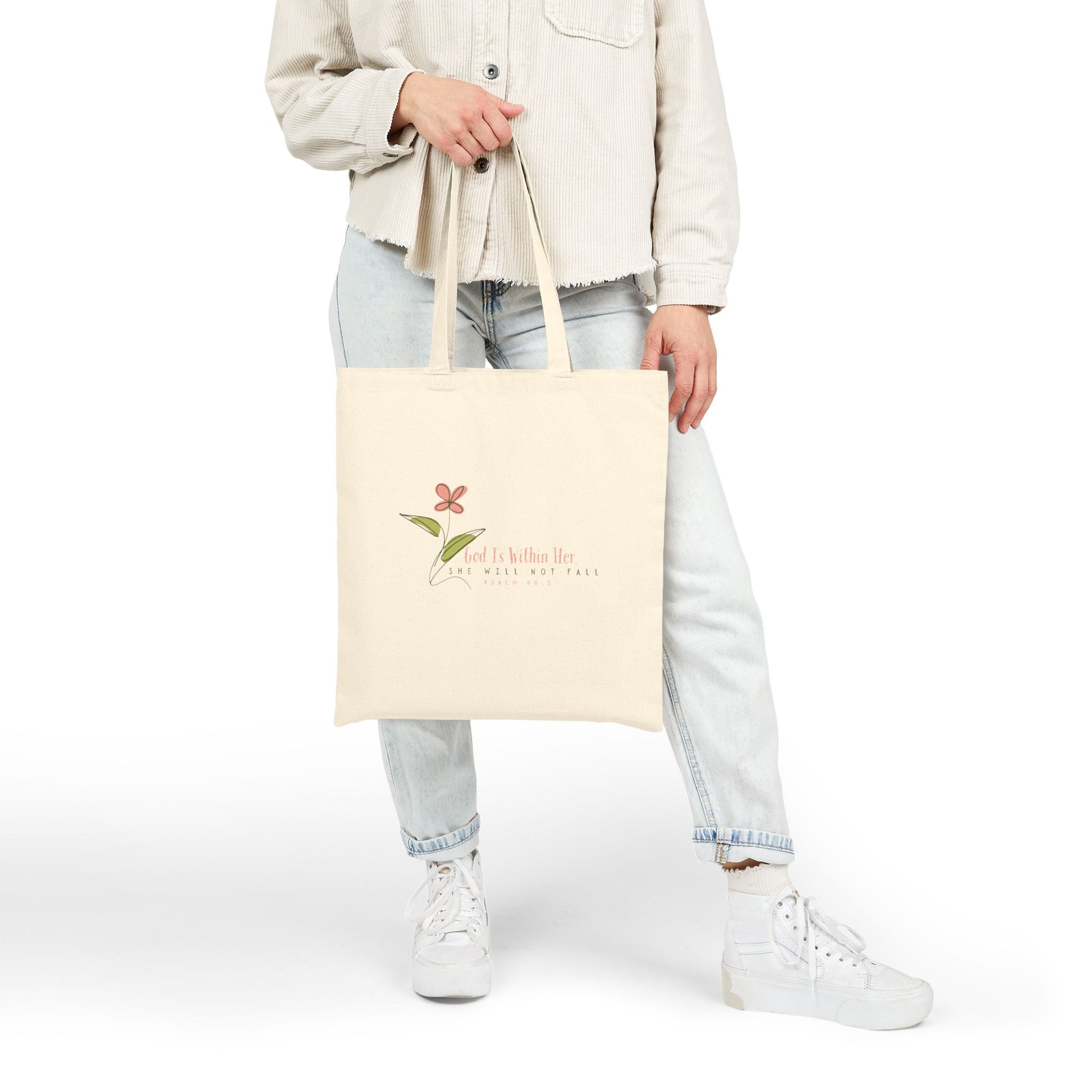 Floral Motivational Tote Bag for Everyday Inspiration, perfect for nature lovers and as a spring wardrobe essential. Featuring Psalm 46:5 design, this unisex tote makes a great gift for her.
